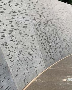One big feature of the memorial is that on the inner side of the outer of the two stone rings are inscribed 4,000 spaced-out horizontal slashes, each representing one of the enslaved laborers. No personal or professional details are known about the vast majority of those persons. For the 950 or so about which something is known, that fragment of information is inscribed above the mark. Sometimes, it is just one name. Sometimes, it is two names. Sometimes it is a job-role, or sometimes a relationship to someone else. Most times, though, nothing is known and the slash is bare.