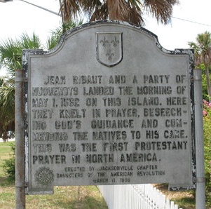 Marker commemorating Ribault’s first landfall in Florida This project was undertaken by Jean Ribault, who led an expedition of some 150 colonists that, after first landing in Florida, then headed north and founded their settlement he called Charlesfort on Parris Island in present-day South Carolina. Later in the year he sailed back home, only to discover the First War of Religion had broken out in his absence. So he went to London, got an audience with QE-1, and starting seeking funding/backing for a return voyage to Charlesfort. But he was imprisoned as a spy. The next year, he was released and allowed to return to France to continue seeking backers there. Meantime, over in Charlesfort things had not gone well: mutinies, fires, etc. (Almost certainly also some native resistance?) The remaining colonists built a makeshift boat to return home in but most of them perished on the voyage.