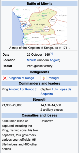 After the battle many people, including nobles and members of the royal family, were captured. Some of these were enslaved and crossed the sea to the Portuguese colony of Brazil and maybe other places in the Americas. It is unknown what happened to most of them. But at some point in 1630 [must be 1670?], the sons of princess Aqualtune (who led a battalion during the battle), Ganga Zumba, his brother Ganga Zona, and their sister Sabina appeared enslaved in an engenho (sugar cane plantation) in the Captaincy of Pernambuco in Northeast Brazil. They led a rebellion at the engenho, escaped, and later formed their own kingdom of Quilombo dos Palmares, a Maroon nation which controlled large areas of northeast Brazil during the Dutch-Portuguese War.