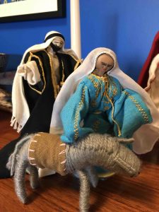 I have in the back of my mind an idea to actually make a little children’s book out of my version of the Christmas story. I was thinking to have the illustrations be staged little scenes featuring portions of our family’s longstanding, beautiful, handsewn Christmas creche set (as pictured above.) To the right, you can see Maryam, Joseph, and the donkey, for example. I also thought maybe I could buy some old GI Joes on eBay so they could depict the soldiers at the checkpoints. (I’m not sure they’d be the right scale?)