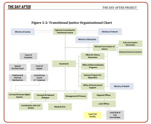 The work of these documentation organizations was also inspired by “The Day After Project”, a project the federally funded U.S. Institute of Peace launched in late 2011 to plan for what decisionmakers in Washington all confidently expected would be the imminent fall of the Assad government. The Day After Project’s final report (PDF) was launched in August 2012, ostensibly by the all-Syrian group of 45 individuals who co-authored it. It contained a lengthy section on “Transitional Justice”, complete with a complex organogram showing how all the proposed parts of this project should be managed.