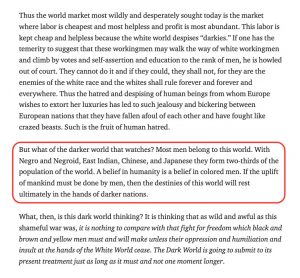 It’s good to realize that Dubois almost certainly chose the title for his essay to serve as a counterpoint to the title of his seminal 1903 essay collection “The Souls of Black Folk.” Thus, in his 1920 essay, he was not only writing about the role that “White” privilege already firmly held in the organization/domination of the world. He was also (as Bill Fletcher noted) exploring the extreme distortion in the souls of white folk that had already, back in 1920, led them to maintain that globe-girdling system of “White” European racial domination for– in many cases, including here in the Americas– several centuries by then.