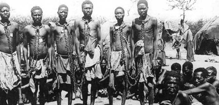 Here is a photo from Namibia, around 1905, showing captured Herero men chained together in work-gangs by very heavy chains in exactly the same way the British settlers had chained the captive Indigenous Australians.