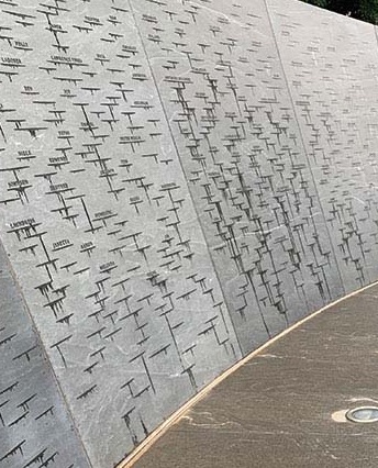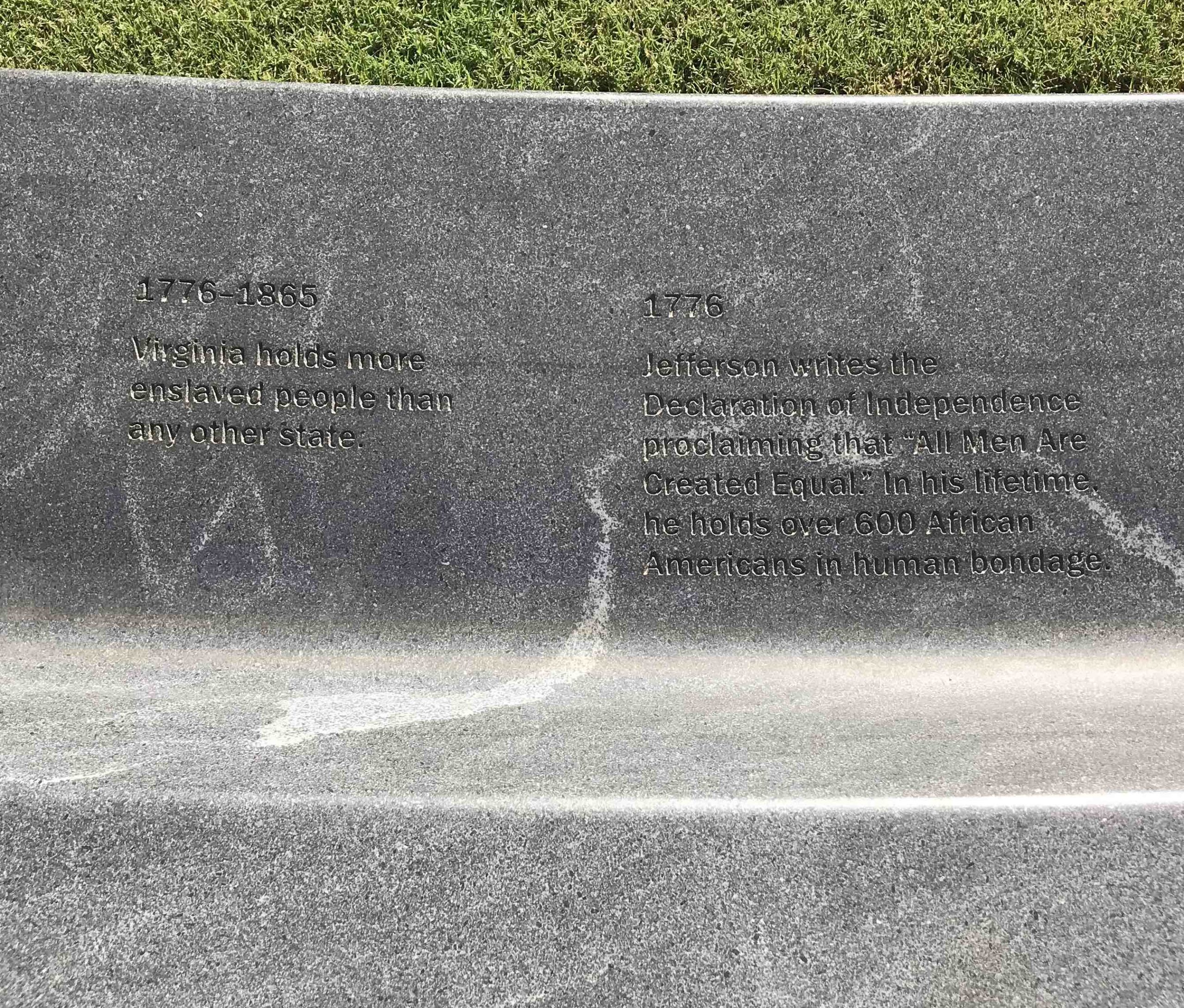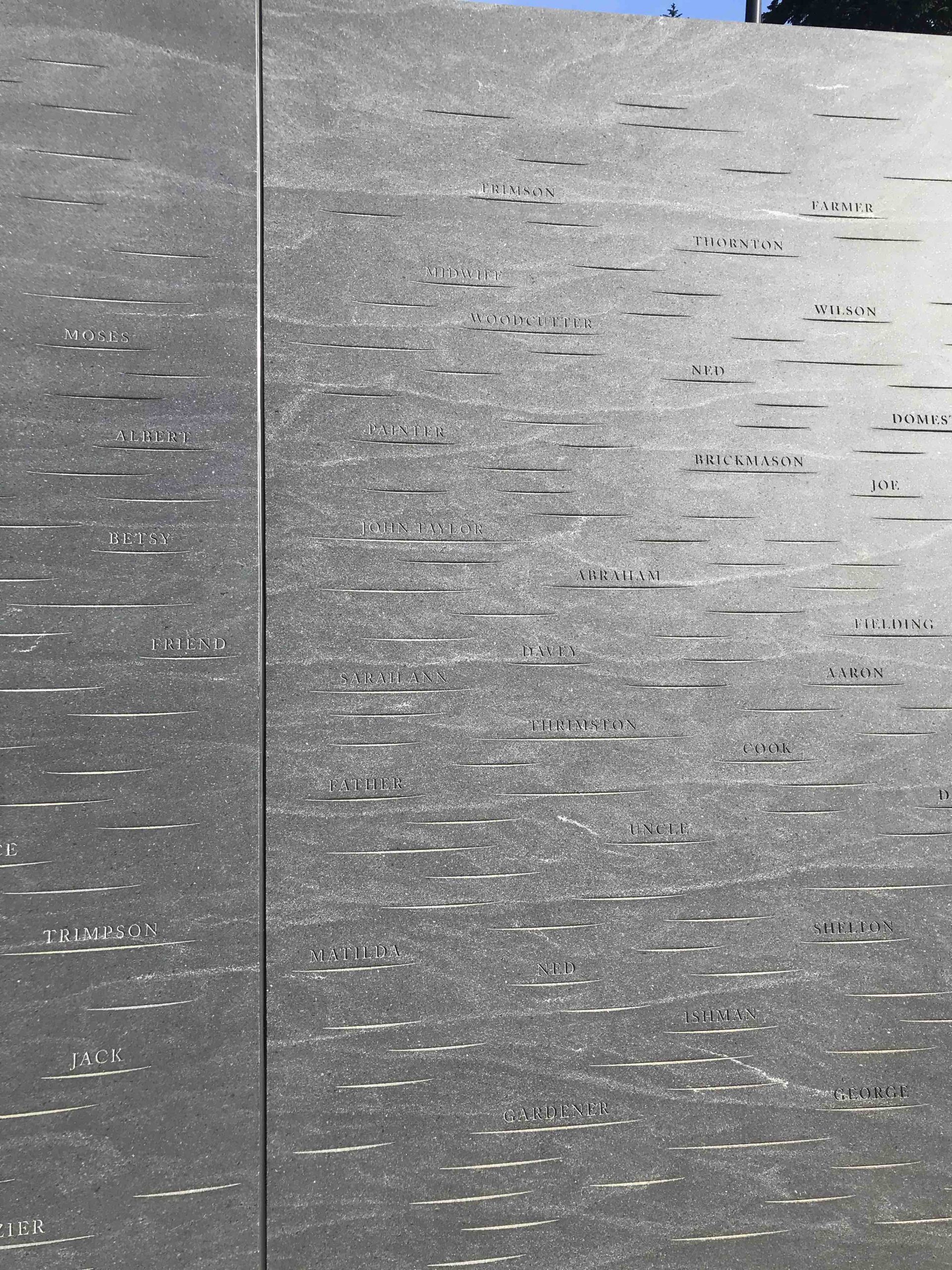 Bill the spouse and I have been lucky enough to get away from Washington DC for a few days, to enjoy the relatively bucolic charms of our former stomping-grounds in Charlottesville, Va. Today, we walked over to the Memorial for Enslaved Laborers that the University of Virginia opened on its famed “Grounds” recently. It is a beautiful memorial, evocative in some ways of the Vietnam Vets Memorial in Washington DC but with a lot of rich layers of additional meaning.