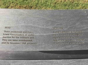 On the inner of the two stone rings, there are inscribed a series of short chronological records of events related to the topics of enslavement and the University. One of these records states that in 1818, “Gilbert, working for a UVA contractor, runs away. The university overseer captures and returns him.” (There is at least one other reference to the university “overseer” returning an enslaved worker who had run away.) There is no description of what form of punishment was dealt to the recaptured person, but one may assume it was pretty violent.