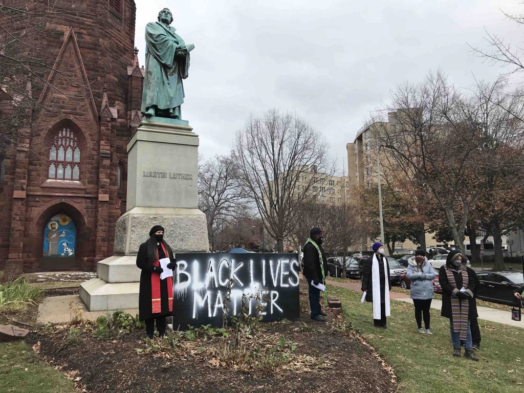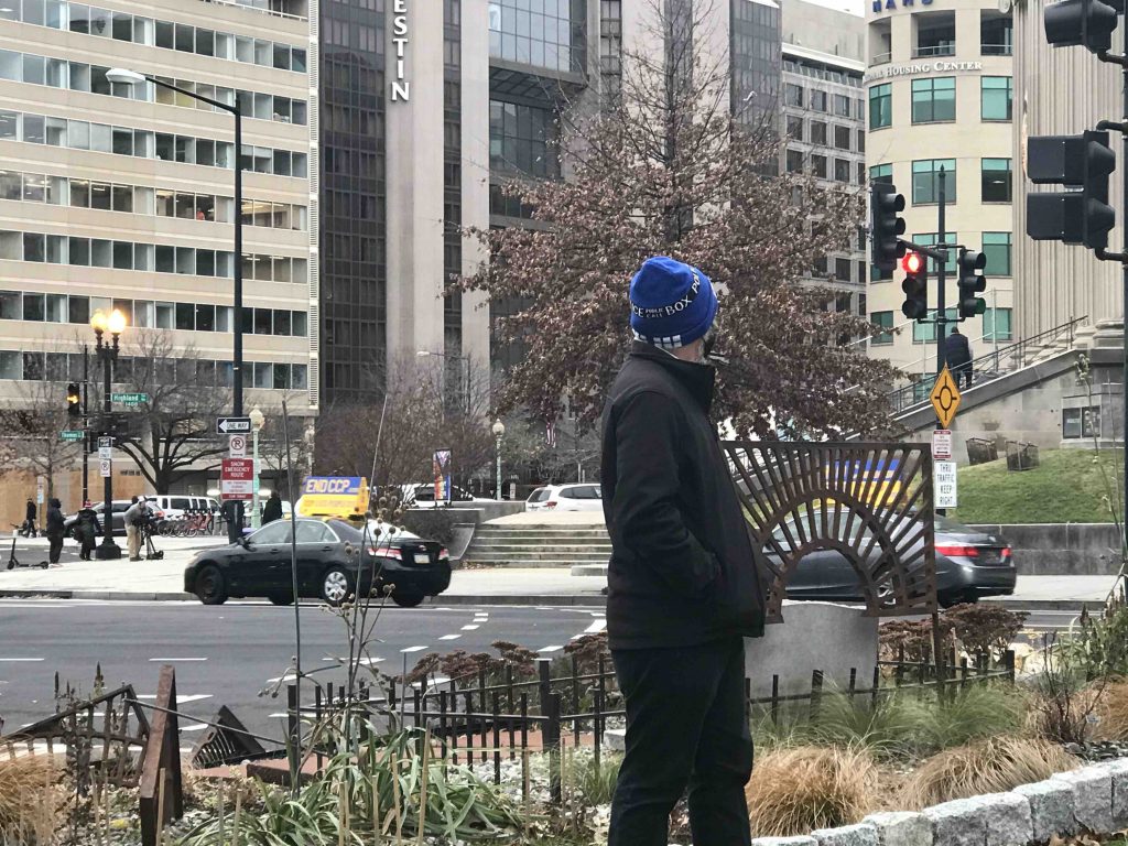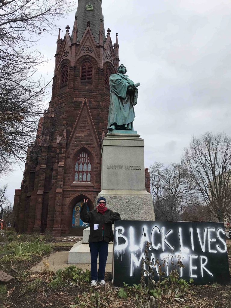 Our Quaker meeting had been in touch in recent weeks with the pastors at the four churches that the MAGAs– who are nearly all not from the city– vandalized when they last came to town, December 12. The pastor at one of them, Luther Place on Thomas Circle NW, sent out a request for clergy to come join her in a prayer vigil at the church yesterday. Specifically, the vigil was at and around the “Black Lives Matter” sign that the church had erected on their grounds to replace the one that the MAGAs tore down and vandalized on December 12. Since Quakers have no distinction between “clergy” and “laity”, three of our meeting’s members turned up for the prayer vigil between 9 and 11 am. There were a total of some 20-24 people in the vigil.