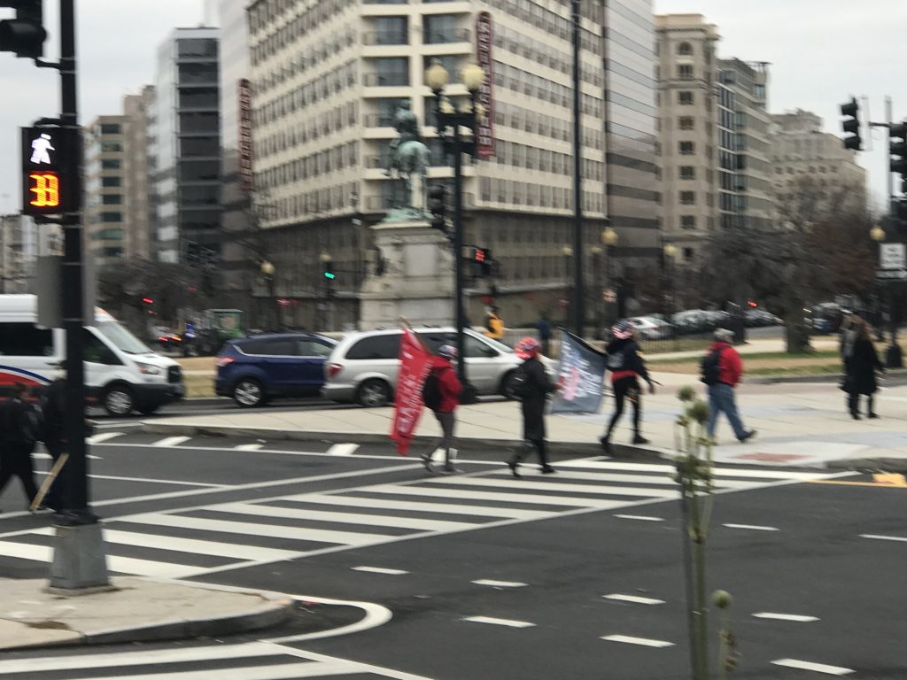 Walking to Luther Place, and then for the two-plus hours I was there, I fairly frequently saw small groups of Trump supporters walking through the streets– usually heading for the White House Ellipse, where he was due to speak at 1 pm but where people had been gathering since early morning. These people were wearing the red hats and other Trump regalia; all resolutely unmasked; many were carrying large flags: either “Trump 2020”, or yellow Gadsden flags, or Stars and Stripes– but all big! They seemed to be people from out-of-town, who had parked near to, or north of, where we were and were walking from their cars to the Ellipse. I also some some emerging from some of the hotels around. It felt like a foreign invasion. Many of them strutted along like conquerors– a bit like Israeli settlers I have seen carrying their flags through occupied East Jerusalem on the annual “Jerusalem Day”, though not as numerous or scary as the East Jerusalem paraders. They seemed to be in generally high spirits.