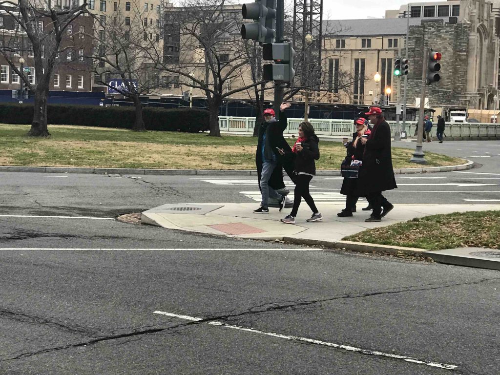 At our vigil, it was cold! A couple of times, one or two MAGAs, seeing what we were doing, would “burst into” the heart of the rough circle we formed in an apparent attempt to disrupt what we doing or anyway to swaggering grab the attention of their fellow-MAGA’s. But those “incursions” were brief and a bit puzzling. None of our vigillers responded and the MAGAs just moved on southward.