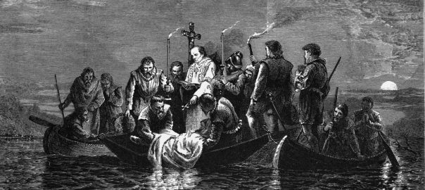 The banner image at the top here is a representation of the burial (in the Mississippi) of De Soto, that was used to illustrate an 1876 U.S. textbook “Pioneers in the settlement of America.”