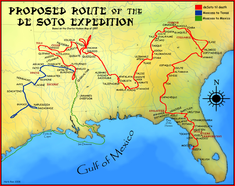 In the Hispanic world, De Soto may have continued to be viewed as a heroic explorer for many years after his death–though in itself, that had been a pretty ignominious moment for him and for the large marauding band of “explorers” that he led. Also, per WP, the Spanish monarch was kind of disappointed that De Soto discovered nothing in Florida etc that came close to comparing with the massive riches he and his compadres had discovered (and looted) in Peru.