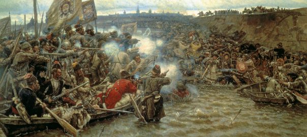 • “After two months, Yermak’s army had finally crossed the Urals. They followed the river Tura and found themselves at the outskirts of Kuchum Khan’s empire. Soon they reached the kingdom’s capital city of Qashliq. On October 23, 1582, Yermak’s army fought the Battle of Chuvash Cape, which initiated three days of fighting against Kuchum’s nephew, Mehmet-kul, and the Tatar army. Yermak’s infantry blocked the Tatar charge with mass musket fire, which wounded Mahmet-kul and prevented the Tatars from scoring a single Russian casualty. Yermak succeeded in capturing Qashliq and the battle came to mark the ‘conquest of Siberia’.”