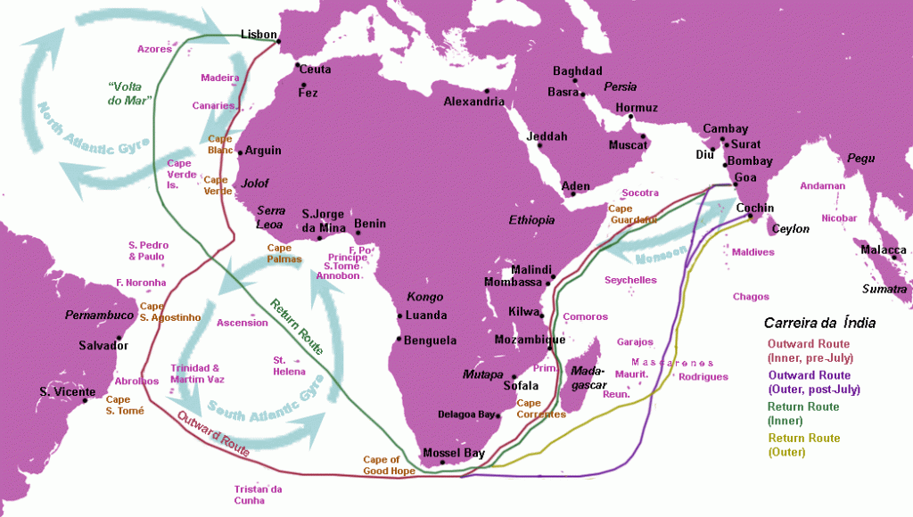 But those ships were always armed. Vasco da Gama had “discovered” the sea route to the Indian Ocean in 1497-99; and from 1500 on, Portugal’s royally chartered “Casa da Índia” in Lisbon would organize an annual Carreira da Índia (“India Run”), a fleet of armed ships that would set out from there and, skilfully using the prevailing winds, would hope to make it around the Cape of Good Hope and over to India, and back, within a year. This amazing page on English-WP provides numerous details about the organization of these fleets: