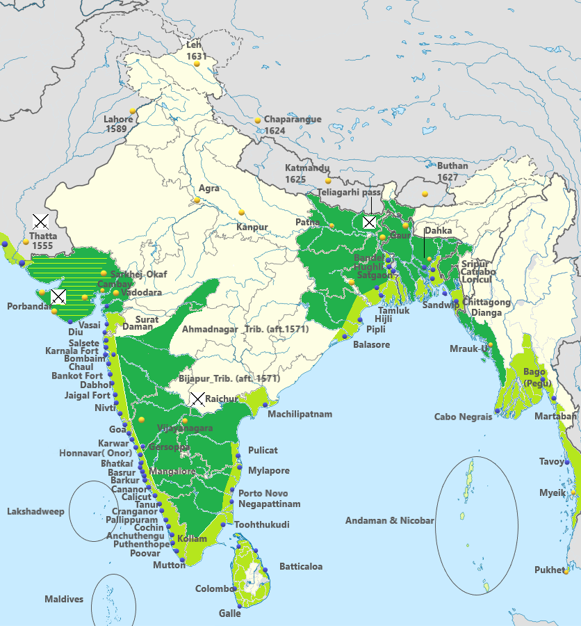 Back in 1510, a Portuguese commander called Afonso de Albuquerque had attacked and captured Goa, on the west coast of India, with a force made up of “23 ships, 1,200 Portuguese soldiers, 400 Portuguese sailors, 220 Malabarese auxiliaries from Cochin, and 3,000 ‘combat slaves’ (escravos de peleja).” He did not take the city easily, but by the end of the year he was in control of it. Goa became an important center of trade for the Portuguese in the Indian Ocean; and in 1530 it became the capital of the whole of the “Portuguese State of India”, a body that for centuries to come would supervise Portuguese affairs all around the coast of India and bordering the whole Indian Ocean from Mozambique to Timor.