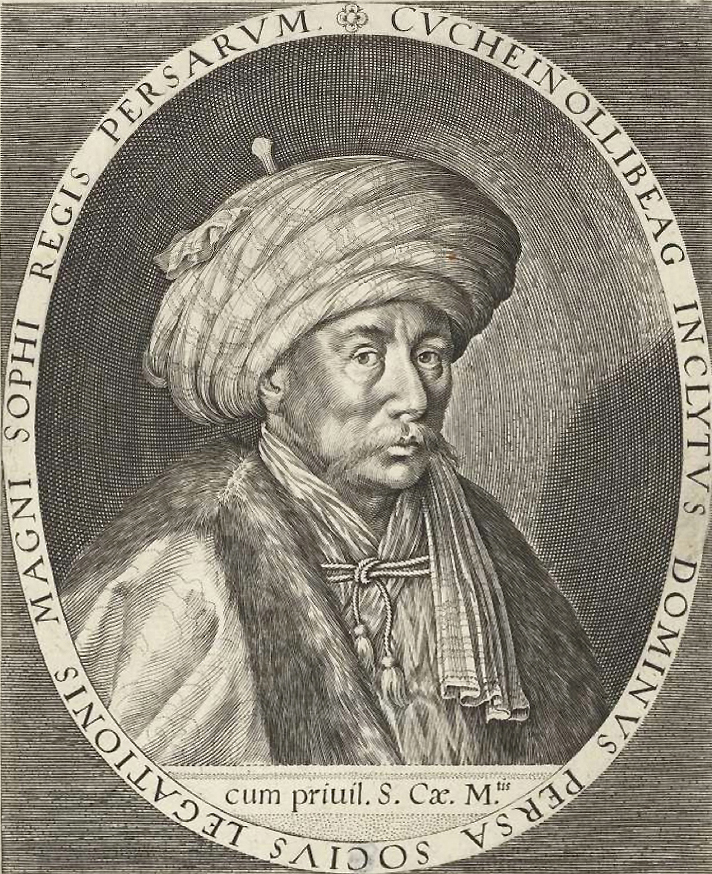 [In Moscow] Hossein Ali Beg and Sir Anthony quarreled over who should have precedence, but Tsar Boris Godunov chose Hossein Ali Beg’s side and even imprisoned Sir Anthony for some time after the Portuguese friar, Nicoloa de Melo made certain accusations against him. In the spring of 1600, Hossein Ali Beg and his retinue left Moscow, and after several stops at various German courts, they eventually arrived in the capital of the Holy Roman Empire, Prague in the autumn of 1600. There, where they were lavishly received, emperor Rudolph II who was already at war with the Ottomans, vowed to pursue the war against them with “great vigour”. After a long stay in Prague, they left for Bavaria, Mantua, and Florence where they were received by the Medicis.