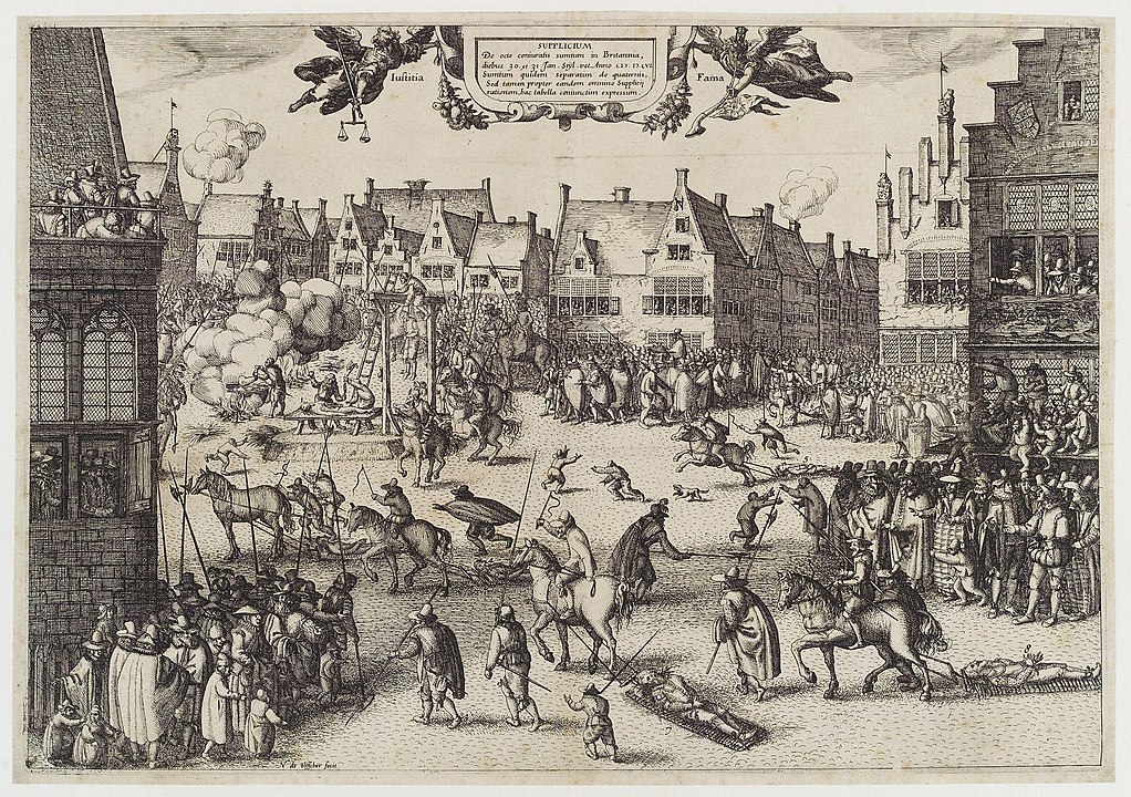 On a cold 30 January, Everard Digby, Robert Wintour, John Grant, and Thomas Bates, were tied to hurdles—wooden panels—and dragged through the crowded streets of London to St Paul’s Churchyard. Digby, the first to mount the scaffold, asked the spectators for forgiveness, and refused the attentions of a Protestant clergyman. He was stripped of his clothing, and wearing only a shirt, climbed the ladder to place his head through the noose. He was quickly cut down, and while still fully conscious was castrated, disembowelled, and then quartered, along with the three other prisoners. The following day, Thomas Wintour, Ambrose Rookwood, Robert Keyes, and Guy Fawkes were hanged, drawn and quartered, opposite the building they had planned to blow up, in the Old Palace Yard at Westminster. Keyes did not wait for the hangman’s command and jumped from the gallows, but he survived the drop and was led to the quartering block. Although weakened by his torture, Fawkes managed to jump from the gallows and break his neck, thus avoiding the agony of the gruesome latter part of his execution.