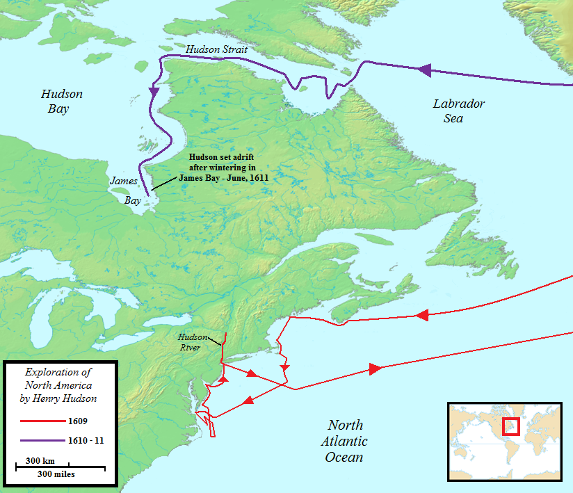In April, Hudson, an Englishman and already an experienced explorer, set out from Amsterdam on a ship owned by the Dutch East India Company (VOC). He was originally instructed to find the long-sought “northeast passage” to East Asia, that is by going northeast around Russia. But he had also heard about a possible “northwest passage” (going around or cutting through North America), so when he got blocked by ice from getting around Russia he headed west instead, touching down in Newfoundland and Nova Scotia, zigzagging around the foot of the Chesapeake, then heading north up the American coast. He found a big, promising-looking river draining southward into the ocean and sailed up it as far as today’s Albany, NY.