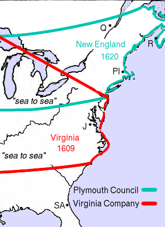 The “sea to shining sea” aspect of this charter mirrored to some extent what the Portugal’s King John II had done in 1534 to organize the colonization of the interior of Brazil. Except that the line drawn by the “London Branch” of the Virginia Company, which was the only branch that had an even semi-viable tiny colony by 1609, veered northwest rather than straight west.