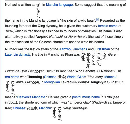 (Nurhaci’s WP page contains some examples of the Manchu vertical script and also the earlier Mongol one. Sadly, they don’t render into my WordPress. I took a screengrab from Wikipedia to display here. Fwiw, Mongolian writing derived from a vertical version of Arabic script. Click to enlarge.)