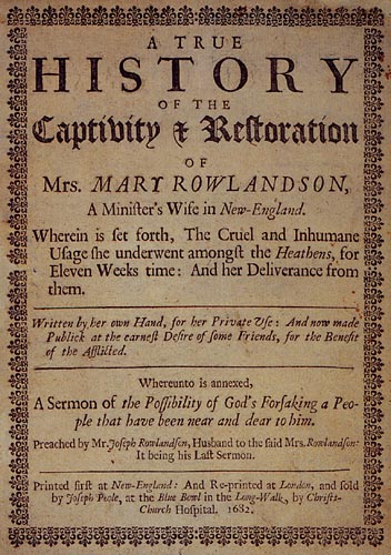Rowlandson’ published her captivity narrative in 1682. It had the title, The Sovereignty and Goodness of God: Being a Narrative of the Captivity and Restoration of Mrs. Mary Rowlandson. WP says of it: “This text is considered a formative American work in the literary genre of captivity narratives. It went through four printings in 1682 and garnered readership both in the New England colonies and in England, leading some to consider it the first American ‘bestseller’.”