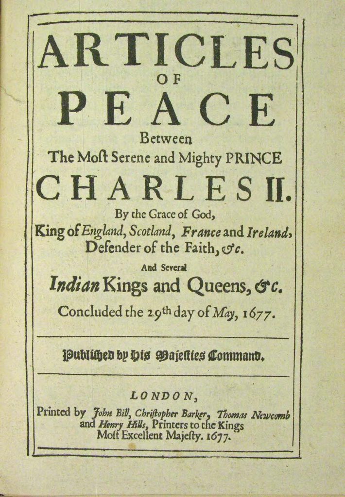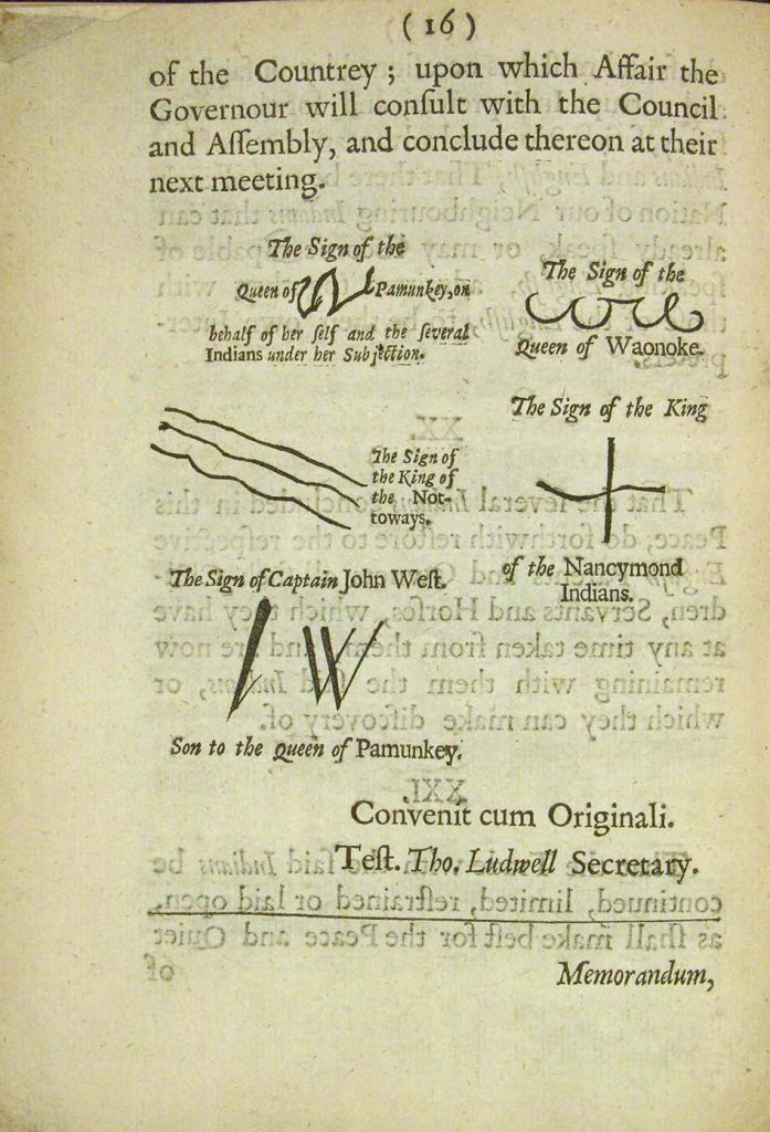 That this Instrument of Peace being Read and Expounded to the several Indian Kings and Queens then present (at the Court at Middle Plantation) by Interpreters Sworn truly to perform the same, the said Indian Kings and Queens Signed and delivered the Articles to the Honourable Governour upon their Knees, and received that other part, Signed and Delivered on behalf of the Kings Majesty, in the same posture of kneeling, of their own accords kissing the Paper as they Transferred it from hand to hand to each other, until every one had done the like Mark of Reverence to it, in sign of a most free and joyful acceptance of this Peace concluded with them.