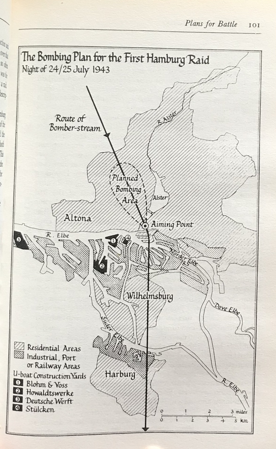Bomber Command carried out the Battle of Hamburg (aka, “Operation Gomorrah”) through four massed, night-time bombing raids carried out over ten nights in late July – early August, 1943. Here’s the map Middlebrook provides for the planned drop zone for the first raid: