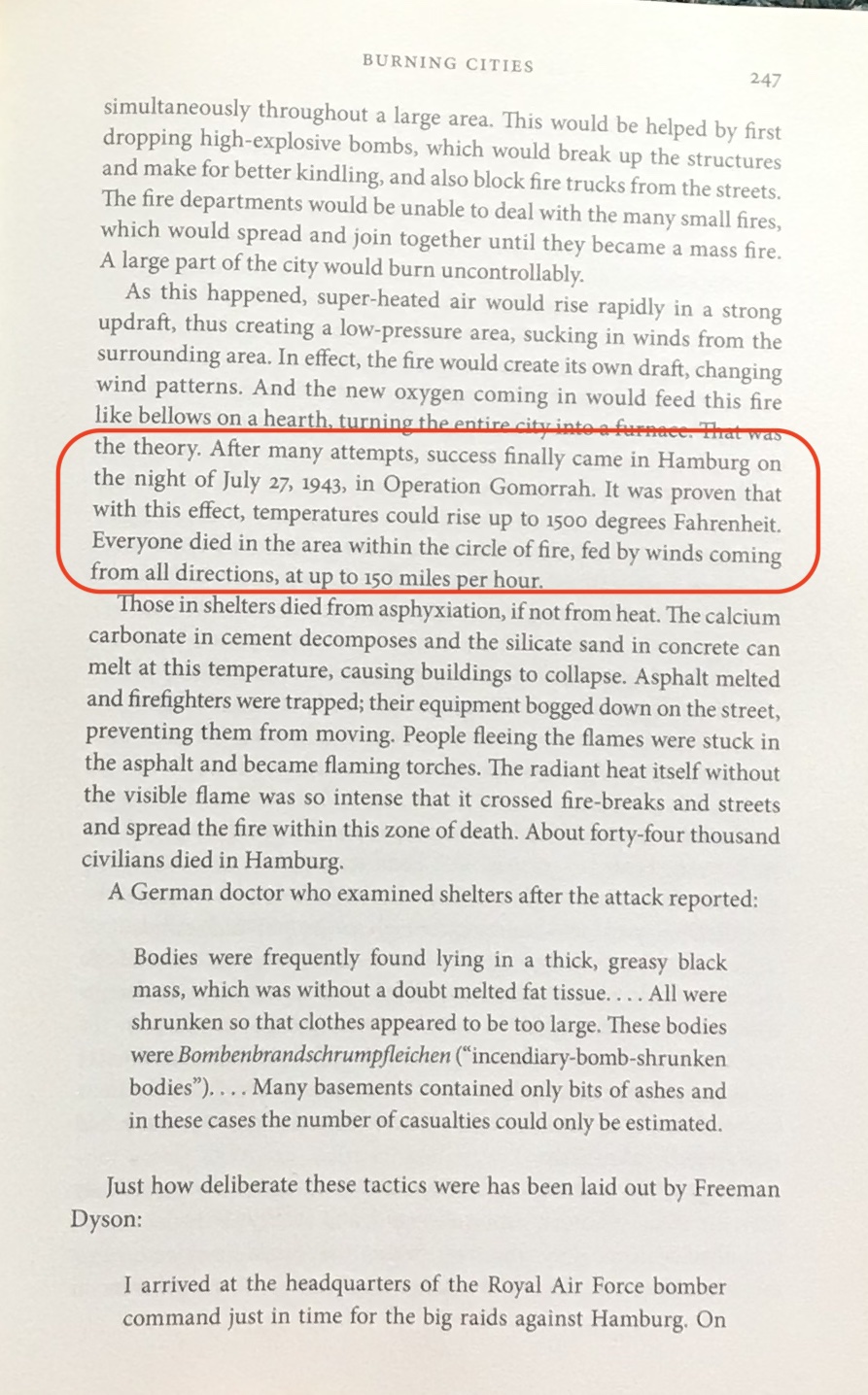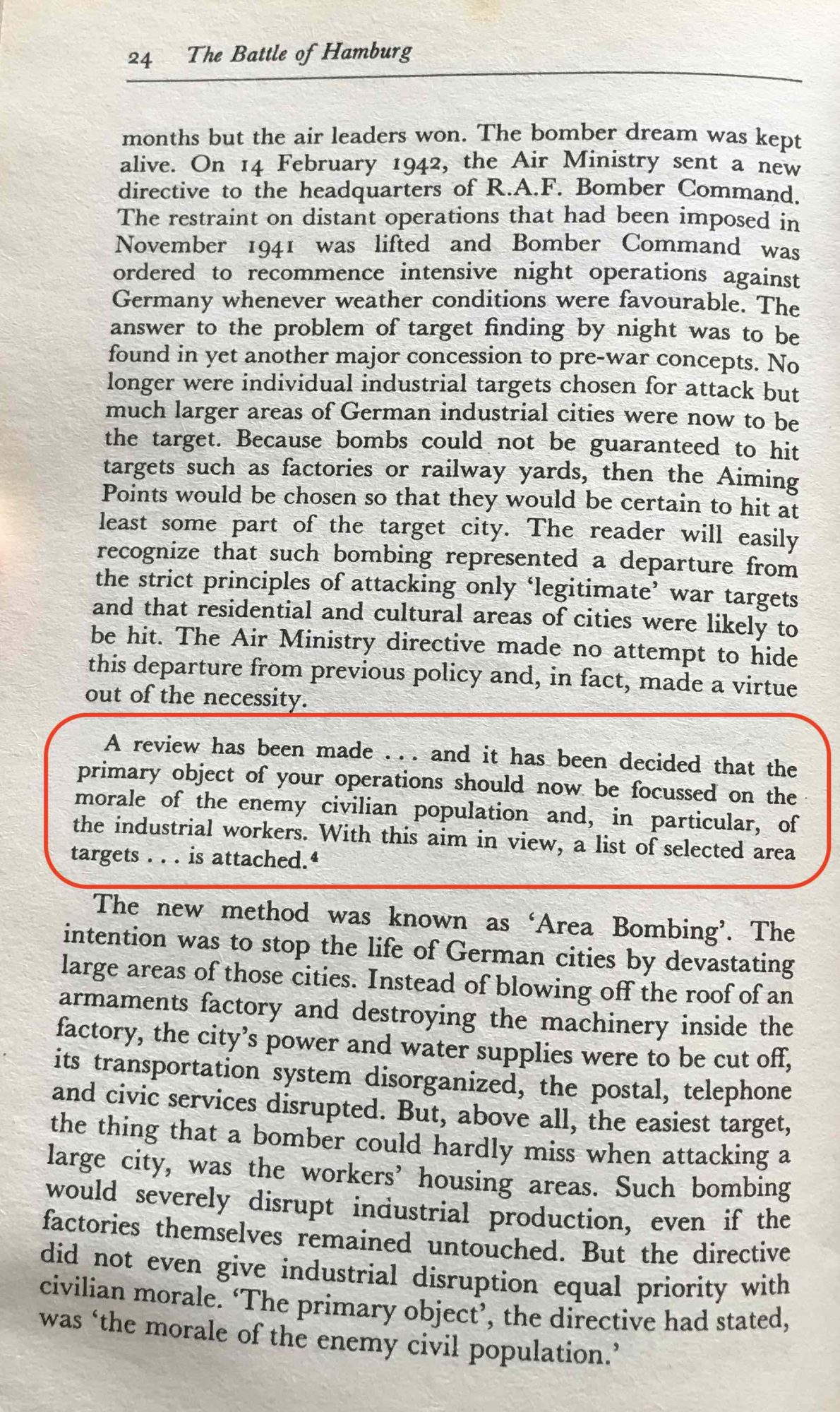 I had briefly discussed this important finding by Ellsberg, in this recent short “Reel” that I made on Just World Ed’s Instagram account. But now I’ve been reading Middlebrook’s very detailed study of the “Battle of Hamburg”, which was the first major campaign that embodied the Bomber Command’s new focus on bombing civilian areas and the first real “success” (as noted by Ellsberg) in its attempt to kill people by creating intense firestorms.