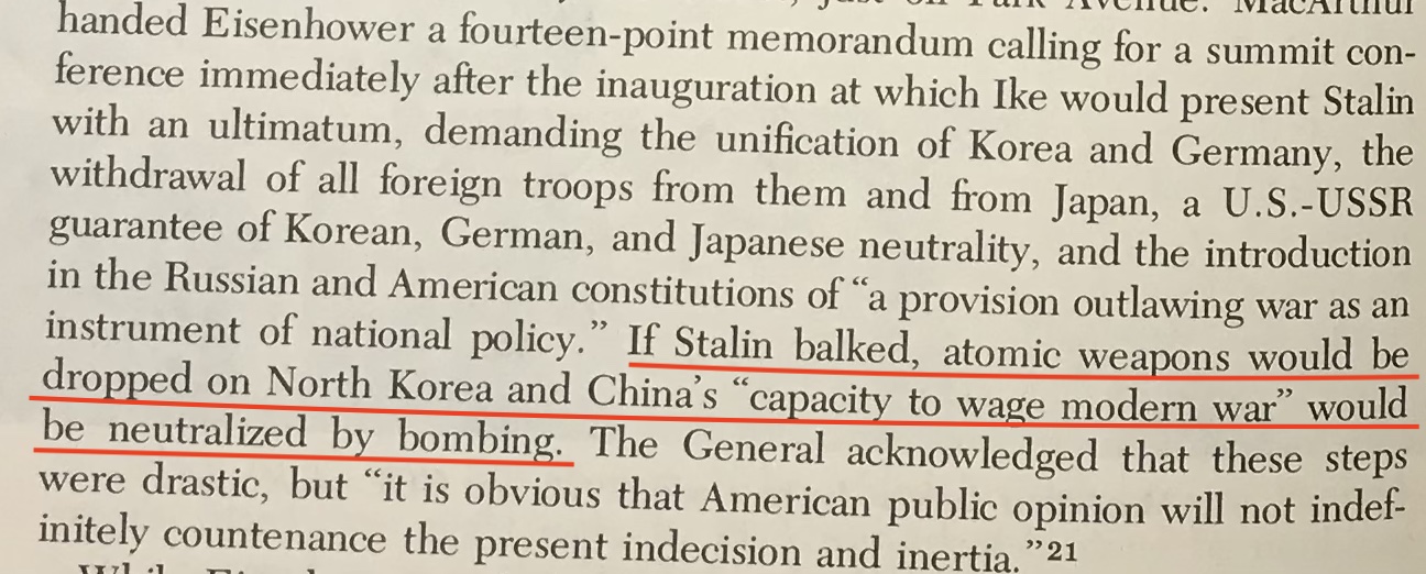 American Caesar includes a great little vignette of how in December 1952, while Eisenhower was still President-elect, he invited MacArthur to meet with him in New York. At the meeting. MacArthur–
