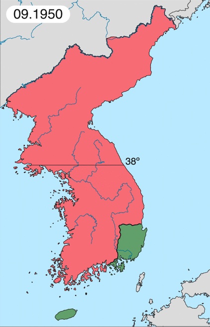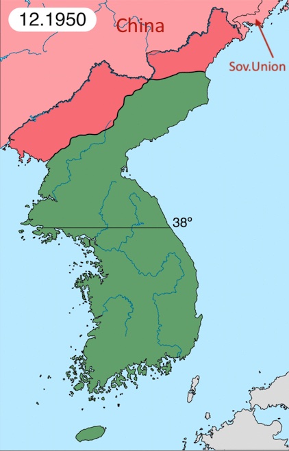 During the Fall months of 1950, MacArthur was able to make impressive gains, that took the U.N. forces far north of the 38th parallel and right up to (North) Korea’s lengthy border with China. But then the Communist forces were able to regroup and return to, essentially, the 38th parallel: