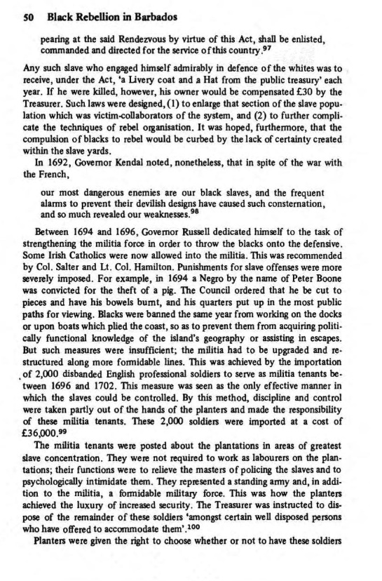 So here we were, on Barbados. The 7.5 pages from Beckles I use here take us through the uncovering of this plot, the horrific aftermath, and the legal measures enacted immediately afterward to clamp down even harder on the enslaved. (On this first page, you can skip down to “The rebels were aware”, if you want):