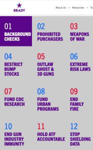 , a veteran organization working for GVP. The organization is named for Pres. Reagan’s Press Secretary James Brady who suffered very serious brain injury when an assailant tried to shoot Pres. Reagan in 1981. The website has a wealth of information and a 12-point plan (digest, at right). bradyunited.org - Giffords, the GVP organization created by former Arizona Rep. Gabby Giffords after she was severely wounded by a shooter in 2011. giffords.org