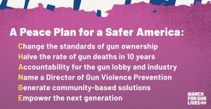 Website of March for Our Lives, the GVP activist organization created by survivors of the massacre at Marjory Stoneman Douglas HS in Parkland, FL. marchforourlives.com In August, M4OL released a 6-point “Peace Plan”. bit.ly/2ub4v3o - Website of the DC-based, nationwide Coalition to Stop Gun Violence, which has many great resources on it. csgv.org